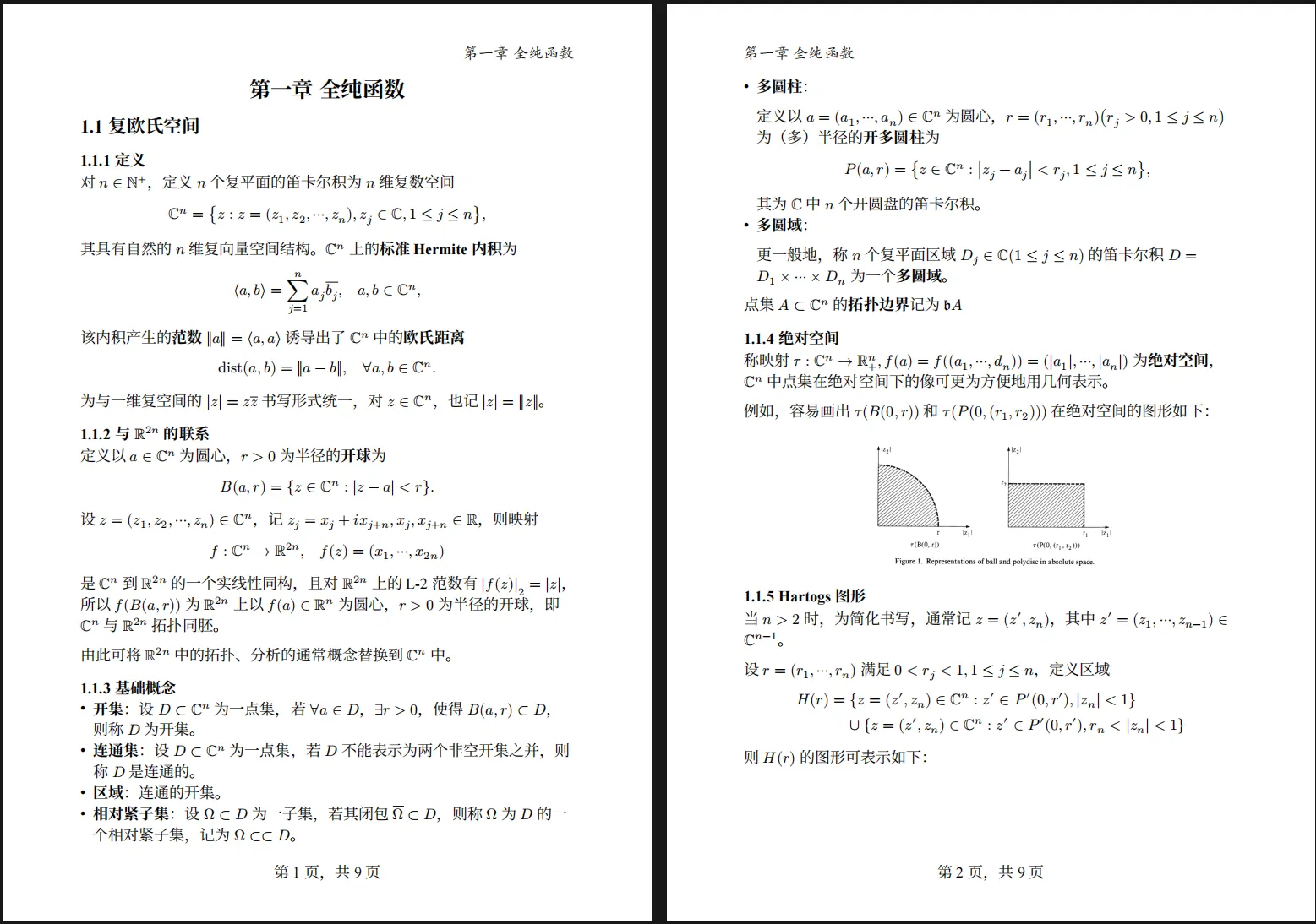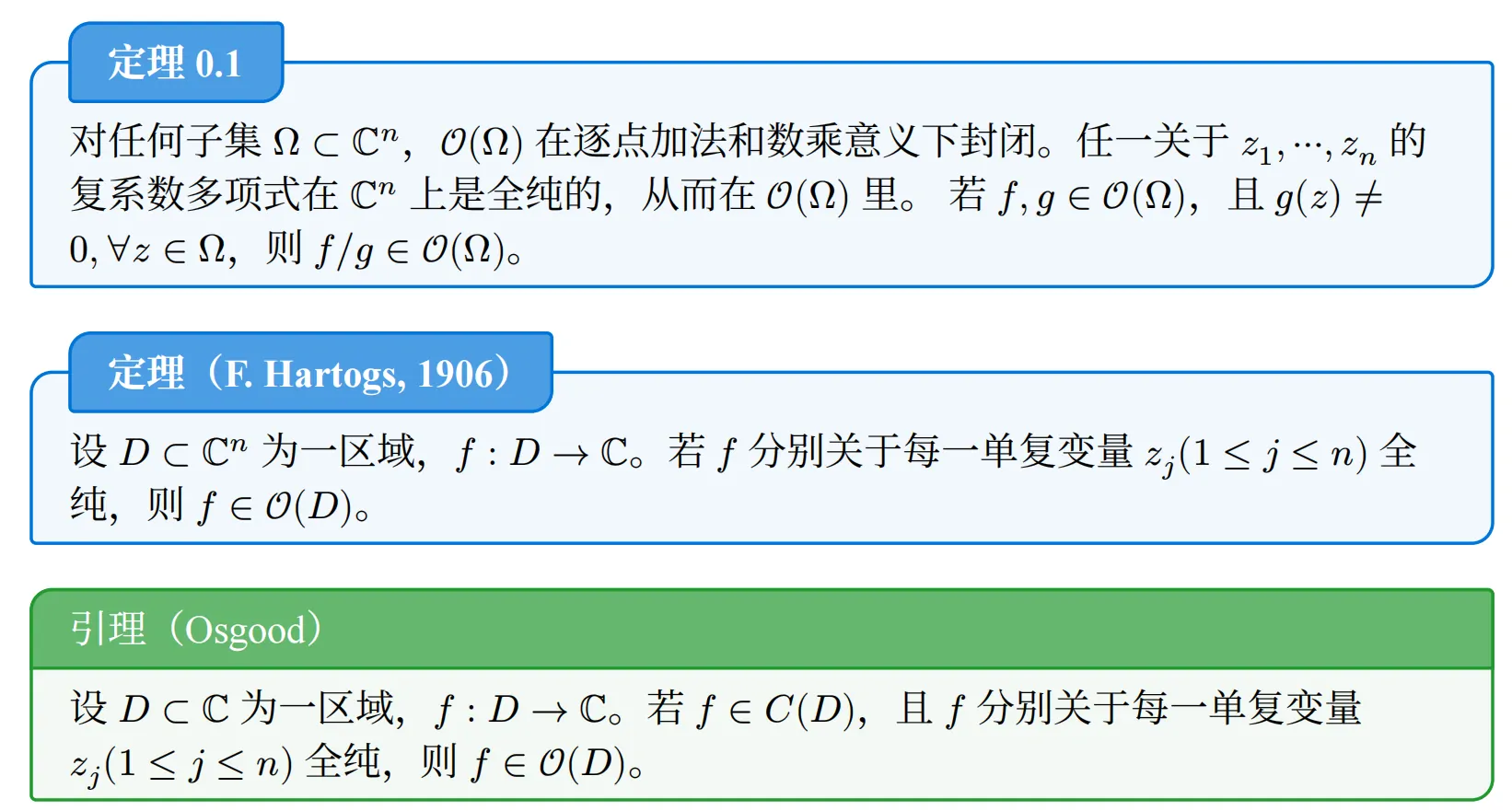 // --------- 使用演示 ---------#show: thmrules#theorem[ 对任何子集 $Omega subset CC^n$,$cal(O)(Omega)$ 在逐点加法和数乘意义下封闭。 任一关于 $z_1, dots.c, z_n$ 的复系数多项式在 $CC^n$ 上是全纯的,从而在 $cal(O)(Omega)$ 里。 若 $f, g in cal(O)(Omega)$,且 $g(z) eq.not 0, forall z in Omega$,则 $f slash g in cal(O)(Omega)$。]#theorem("F. Hartogs, 1906", numbering: none)[ 设 $D subset CC^n$ 为一区域,$f: D -> CC$。若 $f$ 分别关于每一单复变量 $z_j (1 <= j <= n)$ 全纯,则 $f in cal(O)(D)$。]#lemma("Osgood", numbering: none)[ 设 $D subset CC$ 为一区域,$f: D -> CC$。若 $f in C(D)$,且 $f$ 分别关于每一单复变量 $z_j (1 <= j <= n)$ 全纯,则 $f in cal(O)(D)$。]// --------- 使用演示 ---------在文本中使用美观的大括号分类#